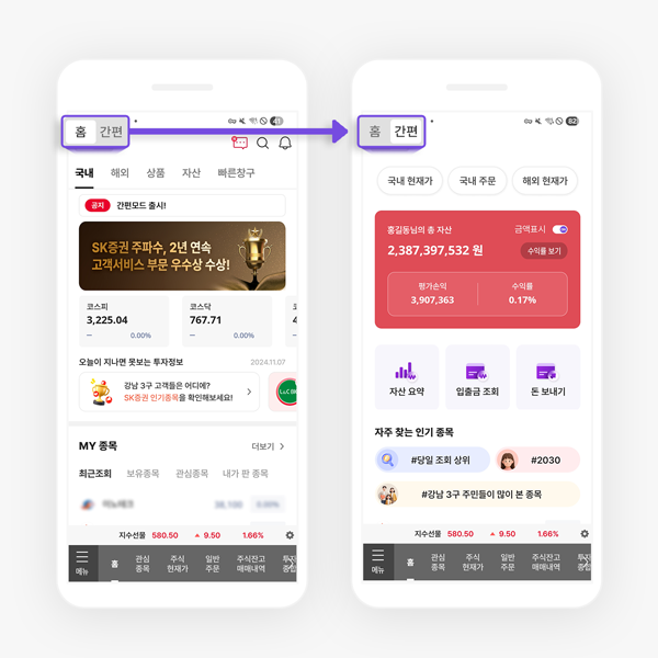 SK증권은 모바일트레이딩시스템(MTS) ‘주파수’의 이용 편의성과 접근성을 강화한 ‘간편홈’과 ‘종목 한눈에 보기’ 서비스를 오픈했다고 14일 밝혔다.