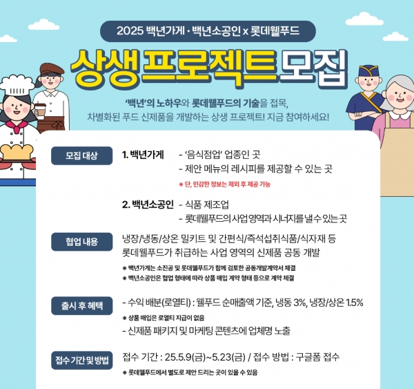 소상공인시장진흥공단이 오는 23일까지 롯데웰푸드와 함께 '2025 백년가게·백년소공인X롯데웰푸드 상생 프로젝트' 참여 업체를 모집한다고 14일 밝혔다.