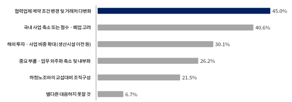 대한상공회의소(대한상의)는 최근 국내기업 600곳과 외국인투자기업 167곳을 대상으로 설문조사를 실시했다. 그 결과 기업의 40.6%가 '국내 사업 축소·철수·폐지 고려', 30.1%가 '해외사업 비중 확대'를 꼽았다. '협력업체 계약조건 변경·거래처 다변화'라고 답한 기업도 45%에 달했다.