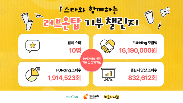 스마일게이트 희망스튜디오(이사장 권혁빈)는 재단법인 ‘바보의나눔’이 진행하는 기부 챌린지 ‘러브온탑’과 연계해 실시한 ‘FUNding’(※FUNding : 희망스튜디오 플랫폼에서 진행되는 기부 캠페인의 총칭) 캠페인을 성황리에 마쳤다고 26일 밝혔다.