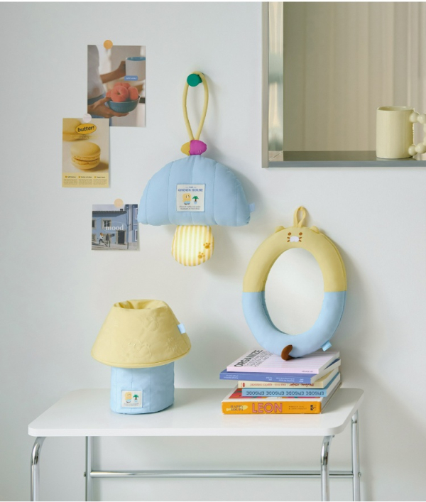 기존 P사의 제품은 패브릭을 활용해 버섯형태의 모양에 스트라이프 형태의 갓을 씌웠고, 아래부분에 동그란 조명을 넣어 패브릭 조명을 완성했다. 카카오프렌즈는 버섯형태의 모양에 하늘색 민무늬 색상의 갓을 씌웠고, 아래 부분에 스트라이프 패턴을 넣어 그 곳에 동그란 조명을 넣어 패브릭 조명을 완성했다.