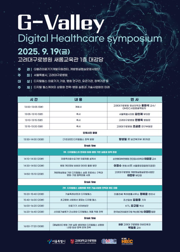 고려대구로병원 민병욱 병원장은 “이번 심포지엄은 디지털헬스케어 분야의 상용화 전략을 공유하고 산·학·연·관 협력 기반을 강화하는 뜻깊은 자리가 될 것이라고 생각한다”며 “구로병원과 G밸리의료기기개발지원센터는 앞으로도 병원 중심 실증 생태계를 확대해 디지털헬스케어 기술이 조기에 상용화되고 의료기기산업 경쟁력 강화에 기여할 수 있도록 적극 지원하겠다”고 말했다.