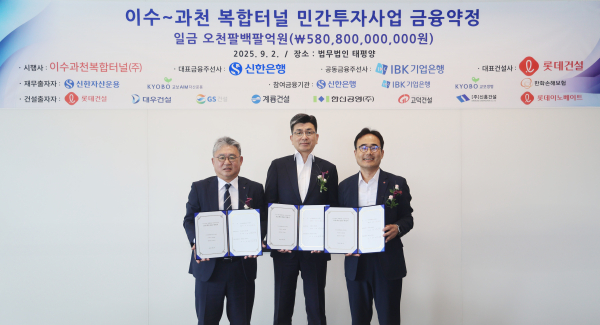 신한은행이 ‘이수과천 복합터널 민간투자사업’의 대표 금융주선기관으로서 민간조달금액 총 5808억원 규모 금융주선을 완료하고 사업시행자 이수과천 복합터널 및 건설주관사 롯데건설과 금융약정식을 진행했다고 2일 밝혔다.