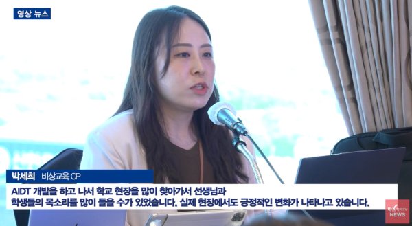 "AIDT 개발을 하고 나서 학교 현장을 많이 찾아가서 선생님과 학생들의 목소리를 많이 들을 수가 있었습니다. 실제 현장에서도 긍정적인 변화가 나타나고 있습니다. 김천의 한 고등학교 선생님께서는 자는 학생이 없어졌다. 학생들이 수업에 진심으로 몰입하는 게 느껴져서 교사로서 오랜만에 희열을 느꼈다고 말씀해 주셨습니다."