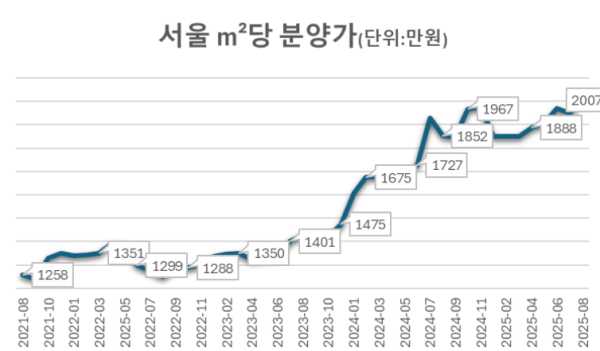 분양평가 전문회사 리얼하우스가 청약홈 자료를 분석한 결과, 2025년 8월 서울 아파트의 ㎡(전용면적 기준) 당 분양가가 2007만원으로 처음 2000만원을 넘어선 것으로 집계됐다. 서울 아파트 분양가는 7월에 비해서는 2.87%, 지난해 같은 기간에 비해서는 8.34% 상승했다.