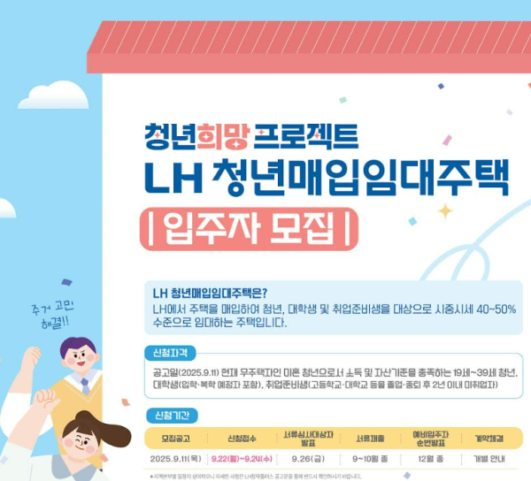 청년매입임대주택은 19세∼39세 청년, 대학생, 취업준비생 등이 대상이다. 서울·경기·인천 등 수도권에 591가구, 그 외 지역은 641가구가 공급된다.