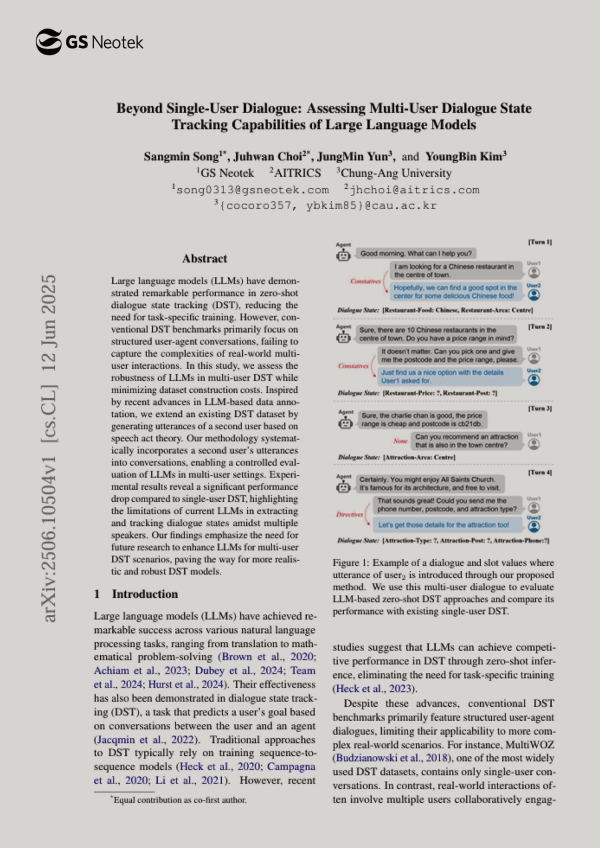송 엔지니어가 1저자로 참여한 이번 논문 ‘Beyond Single-User Dialogue: Assessing Multi-User Dialogue State Tracking Capabilities of Large Language Models’(단일 사용자 대화를 넘어: LLM의 다중 사용자 대화 상태 추적 성능 평가)는 실제 고객 응대 환경과 유사한 다중 사용자 대화 상황(Multi-User Dialogue)을 설정하고 대규모 언어모델(LLM) 대화 상태 추적(DST) 성능을 체계적으로 검증한 연구다.