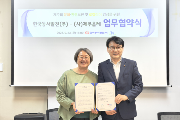 한국동서발전은 제주사업추진단·제주올레와 지난 23일 서귀포 제주올레여행자센터에서 ‘제주의 문화·자연환경 보전 및 지역인재 양성을 위한 업무협약’을 체결했다고 24일 밝혔다.