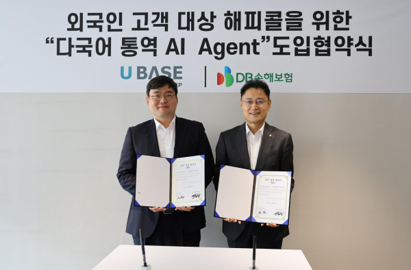 DB손해보험은 지난 22일 서울 중구 소재 유베이스 본사에서 금융권 최초 ‘다국어 통역 AI AGENT’ 서비스 도입에 따른 업무협약식을 체결했다고 25일 밝혔다.