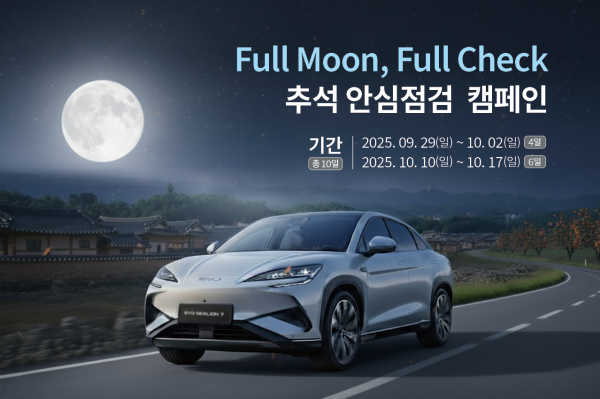 BYD코리아가 추석 연휴를 맞아 장거리 운행 전∙후 무상점검 서비스를 받을 수 있는 ‘풀문, 풀체크(Full Moon, Full Check) 무상점검 서비스 캠페인’을 실시한다고 26일 밝혔다.
