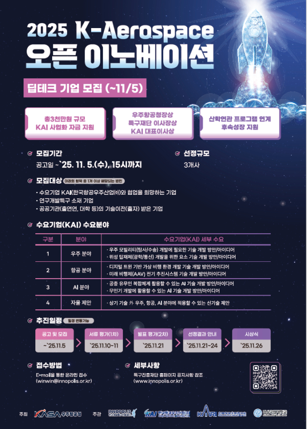 KAI(한국항공우주산업)가 '2025 K-Aerospace 오픈 이노베이션'에 공동 주관기관이자 수요기업으로 참여해 딥테크 기업과 기술협력에 나선다.