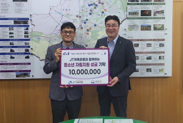 JT저축은행은 성남시청과 함께 지역 자립 청소년의 사회 안착을 위해 성남시 청소년자립지원관에 후원금을 전달했다고 16일 밝혔다.