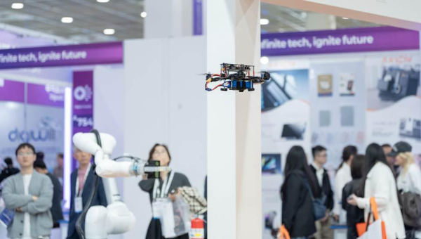 양사 관계자는 “이 드론은 아웃도어용 보다 작은 크기인 인도어 형태로 세팅됐다”며 “실내 관람객 안전을 위해 지정된 장소를 비행하는 규모로 시연됐다”고 말했다. 또 “GPS 신호 없이 비전 카메라만으로 사물을 인식하고 자가 생성한 좌표로 완전 자율 비행을 선보였다”고 설명했다.