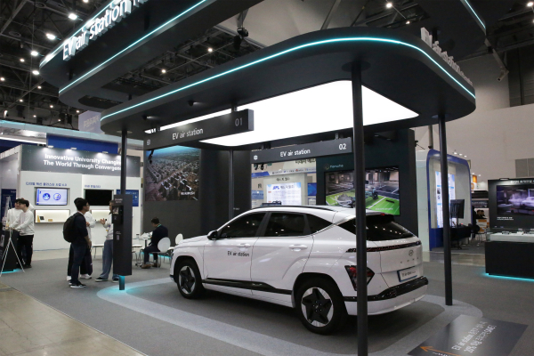 EV air station은 천장에서 커넥터가 내려오는 차세대 전기차 충전시스템으로, 지능형 전력분배 기술을 적용해 하나의 충전기로 최대 3대의 차량을 동시에 충전시켜 공간 효율성과 편의성을 높인 제품이다.