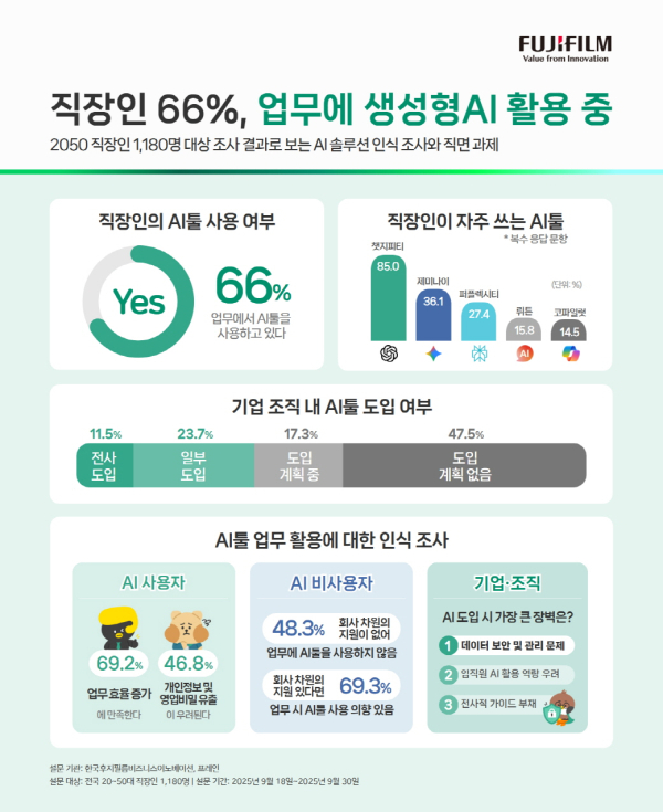 한국후지필름비즈니스이노베이션(이하 한국후지필름BI)이 지난 9월 18일부터 30일까지 20대부터 50대 직장인 1180명을 대상으로 실시한 ‘직장인 AI·AX 솔루션 인식 조사’ 결과를 발표했다고 23일 밝혔다. 이번 조사는 AI 기술이 업무 현장에 어떤 방식으로 도입·활용되고 있는지와 이에 대한 직장인들의 인식을 알아보기 위해 실시됐다. 조사에 따르면 응답자의 66%가 현재 업무에서 인공지능(AI) 툴을 활용하고 있다고 답했다.