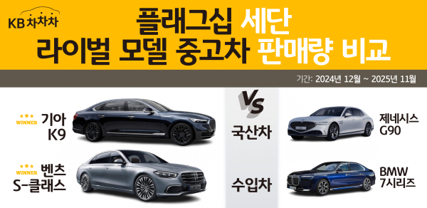 KB캐피탈은 자사 중고차 거래 플랫폼 ‘KB차차차’를 통해 지난해 12월부터 1년간 플래그십 세단 판매 데이터를 분석한 결과, 국산은 기아 K9, 수입은 벤츠 S클래스가 가장 높은 판매량을 기록했다고 12일 밝혔다.