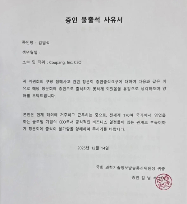 15일 유통업계에 따르면 김범석 의장은 오는 17일로 예정된 국회 과학기술정보방송통신위원회의 개인정보 유출 관련 청문회에 참석하지 못한다고 공식 통보했다. 김 의장은 전날 오후 해외 비즈니스 일정으로 인해 청문회 출석이 어렵다는 사유서를 제출했다.