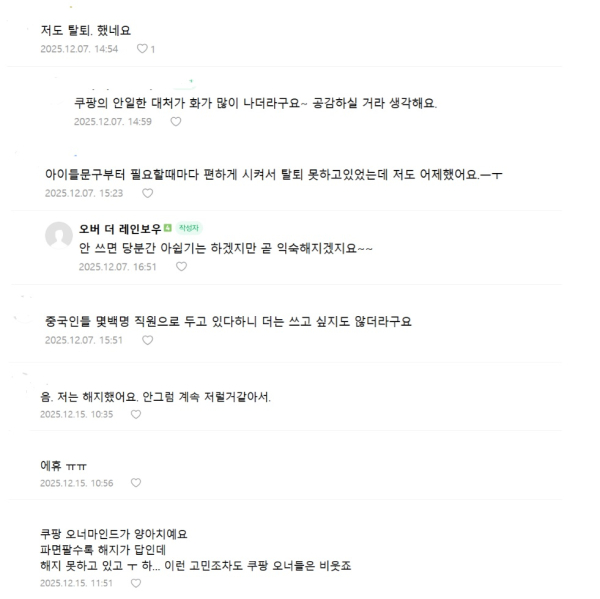 네이버 유명 맘카페에서도 "회사측의 대응이 '할많하않'이네요. 앞으로 다시는 가입하지도 사용하지도 않으려고요" "쿠팡 오너마인드가 양아치예요" "해지했어요. 그렇지 않으면 계속 그럴 것 같아서요" 등의 비판이 쏟아졌고, 많은 회원들이 탈퇴 소식을 공유했다.