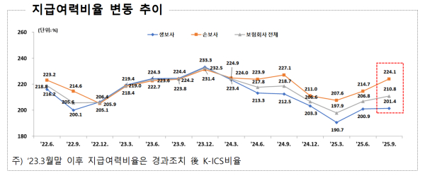 생명보험사와 손해보험사는 각각 201.4%, 224.1%로 전분기 대비 0.5%p, 9.5%p 늘어난 것이다.