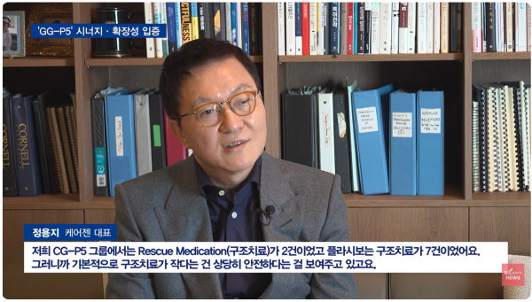 "저희 CG-P5 그룹에서는 Rescue Medication(구조치료)가 2건이었고 플라시보는 구조치료가 7건이었어요. 그러니까 기본적으로 구조치료가 작다는 건 상당히 안전하다는 걸 보여주고 있고요."