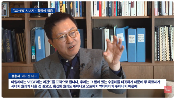 "아일리아는 VEGF라는 리간드를 표적으로 합니다. 우리는 그 밑에 있는 수용체를 타깃하기 때문에 두 치료제가 시너지 효과가 나올 것 같고요. 황산화 효과도 뛰어나고 오토파지 액티비티가 뛰어나기 때문에 결국엔 건성 황반변성이 문제가 될 수 있는 RPE세포의 액티비티에 대한 개선 그리고 드루젠을 잘 제거할 수 있을 것 같다라는 충분한 과학적 데이터가 있기 때문에..."