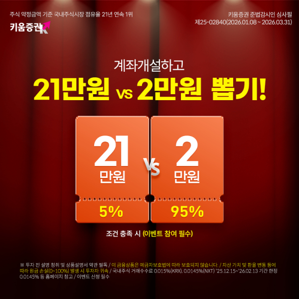 이벤트에 참여한 신규 고객은 추첨을 통해 5% 확률로 21만원, 95% 확률로 2만원의 당첨 기회를 얻는다. 우선 영웅문S# 앱을 통해 비대면 계좌를 개설하면 개설 계좌로 다음 영업일에 1만원이 지급된다. 이후 이벤트 기간 중 국내 주식(ETF·ETN 포함)을 100만원 이상 거래할 경우, 당첨 금액과 1만원의 차액이 다음 영업일에 추가로 지급된다.