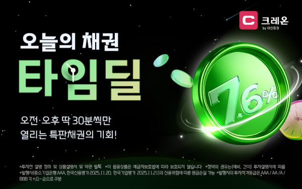 대신증권은 온라인 채권 고객 저변 확대와 차별화된 투자 경험 제공을 위해 ‘온라인 채권 타임딜’ 프로모션을 시작한다고 15일 밝혔다.