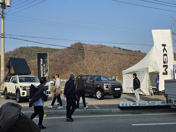 KGM은 행사 분위기와 어울리도록 캠핑 장비와 레저 용품을 배치한 아웃도어 콘셉트의 전시 부스를 마련하고, 픽업 모델인 ‘무쏘’와 ‘무쏘 EV’를 선보였다.