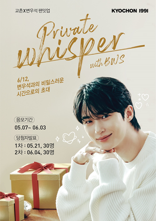 특히, 이번 팬밋업은 교촌의 창립 연도와 같은 1991년에 태어난 ‘교촌둥이’ 배우 변우석과 교촌 팬들이 직접 만나 소통할 수 있는 자리다. ‘Private Whisper(프라이빗 위스퍼)’라는 콘셉트 아래, 6월 12일(목) 펼쳐지는 변우석과 함께하는 비밀스럽고 특별한 순간으로 고객들에게 잊지 못할 추억을 제공할 예정이다