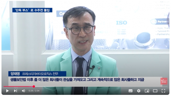 "생물보안법 이후 좀 더 많은 회사들이 관심을 가져오고 그리고 계속적으로 많은 회사들하고 지금 다음 단계의 논의도 지속되고 있어서 그런 차에 저희도 내부적으로도 회사가 좀 더 커져가고 있구나라는 걸 느끼고 있어서 부스도 더 크게 한번 해보자라고 생각하고 나왔습니다."
