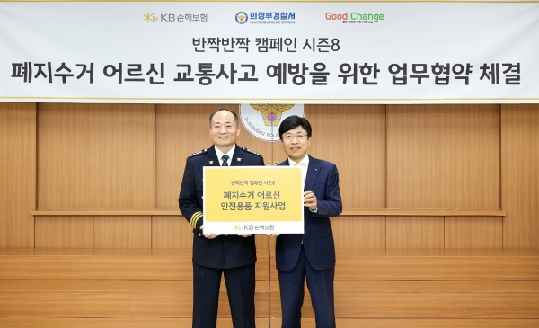 KB손해보험은 8일, 어버이날을 맞아 의정부경찰서에서 KB손해보험 이영찬 브랜드홍보본부장과 이상엽 의정부경찰서장 등이 참여한 가운데 폐지수거 어르신을 위한 ‘반짝반짝 캠페인’을 진행했다.