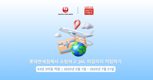 일본항공(JAL)이 롯데면세점과 제휴를 통해 5월 1일부터 7월 31일까지 모든 JMB(JAL MILEAGE BANK) 회원에게 구매액 미화 3달러당 2마일을 증정한다고 9일 밝혔다.