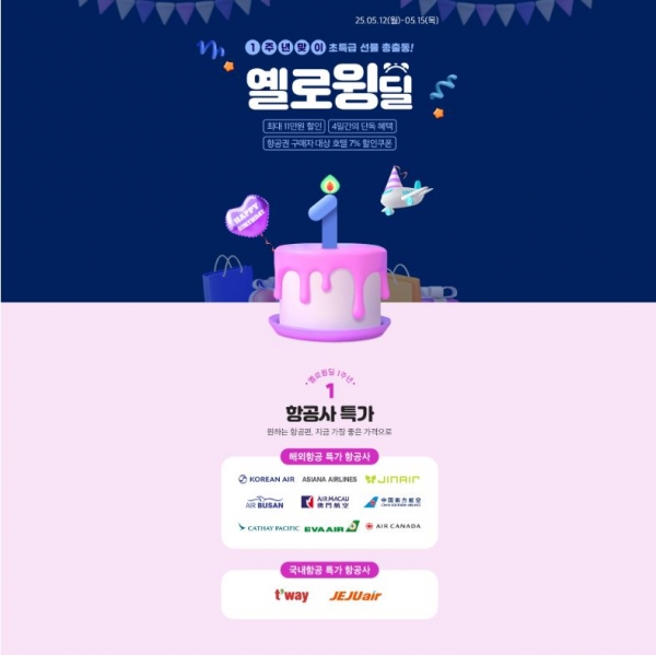 노랑풍선이 ‘옐로윙딜’의 론칭 1주년을 맞아 오는 15일까지 총 4일간 다양한 혜택이 담긴 프로모션을 진행한다고 12일 밝혔다.