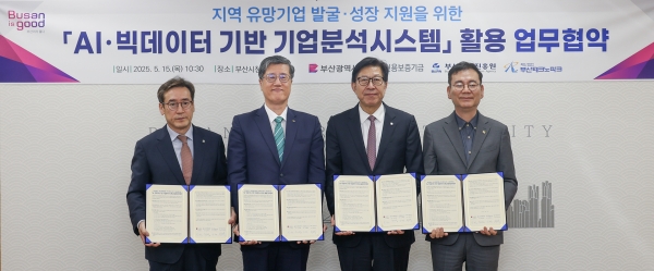 신용보증기금(이사장 최원목)이 부산광역시(시장 박형준), 부산경제진흥원(원장 송복철), 부산테크노파크(원장 김형균)와 함께 ‘AI·빅데이터 기반 기업분석시스템 활용 업무협약’을 체결했다고 밝혔다.
