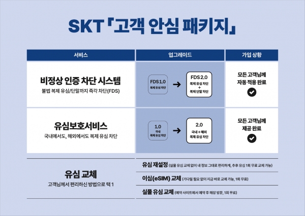 SKT는 “유심보호서비스 업그레이드와 FDS고도화, 유심교체 가속화까지 포함해 혹시 모를 유심 불법복제와 불법 복제폰 등 사이버 침해 피해로부터 고객들을 효과적으로 보호할 수 있는 ‘고객안심 패키지’가 완성됐다”며, “해킹으로 가능한 피해로부터 고객을 보호할 수 있는 다중 안심망이 완료됐고, SKT가 피해를 100% 책임지겠다고 밝힌 만큼 고객들은 믿고 안심하셔도 된다”고 밝혔다.