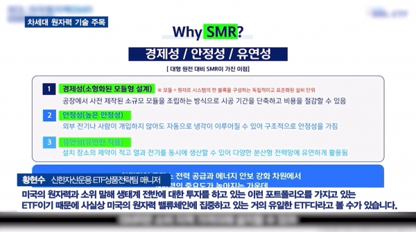 "미국에 상장되어 있는 발전소라든지 또는 이제 새로운 차세대 원전을 개발하는 SMR 그리고 이제 설계나 건설 등을 담당하고 있는 기업들... 미국의 원자력과 소위 말해 생태계 전반에 대한 투자를 하고 있는 이런 포트폴리오를 가지고 있는 ETF이기 때문에 사실상 미국의 원자력 밸류체인에 집중하고 있는 거의 유일한 ETF다라고 볼 수가 있습니다."