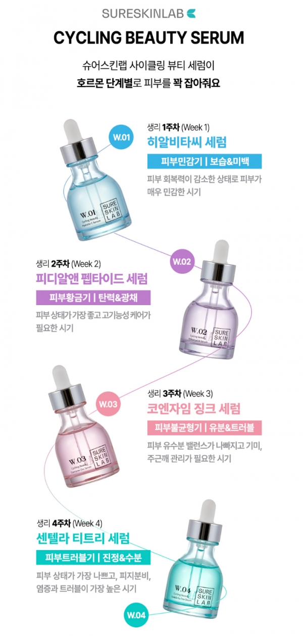 ‘사이클링 뷰티 세럼’은 여성의 호르몬 주기에 따른 피부 변화에 주목해 개발된 제품으로, 생리 주기에 따라 주차별로 사용하는 4종 세럼으로 구성된다. 피부 트러블, 붉어짐 등 주기적인 변화에 과학적으로 대응하는 새로운 스킨케어 접근 방식으로, 업계에 새로운 카테고리를 제시했다는 평가를 받고 있다.