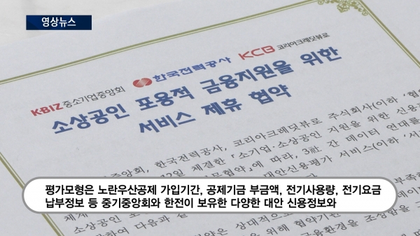 중소기업중앙회, 한국전력공사, 코리아크레딧뷰로가 금융 취약계층 소상공인을 위한 대안신용평가 모형을 개발하고 '소상공인 포용적 금융지원을 위한 서비스 제휴'를 위해 손을 맞잡았습니다.