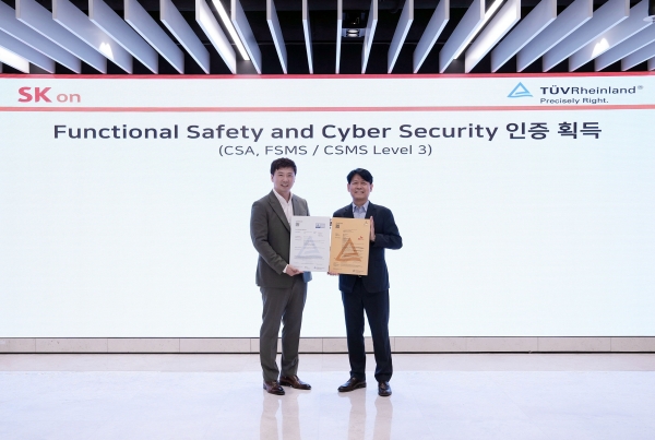 SK온은 글로벌 시험∙인증 전문기관 TUV 라인란드로부터 사이버 보안 인증, 기능 안전 관리 체계(FSMS) 레벨3 인증 등 총 두 건의 국제 인증을 획득했다고 10일 밝혔다.