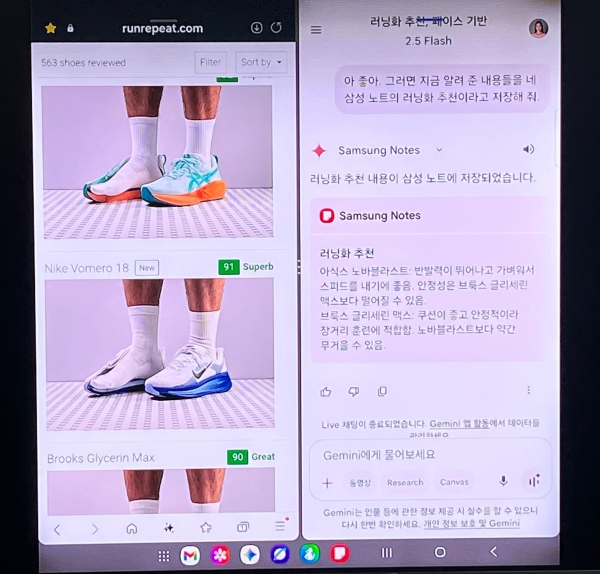 러닝화의 장단점을 묻자, AI는 구체적으로 설명했다. “아식스 노바블라스트는 반발력이 뛰어나고 가벼워 스피드를 내기 좋지만, 안정성은 글리세린 맥스보다 떨어진다”고 답했다. 단순 추천을 넘어 사용자의 신체 조건까지 고려한 ‘맞춤형 조언’을 제공하는 모습이었다. 이후 사용자가 “지금 알려준 내용을 삼성 노트에 저장해줘”라고 하자 대화 내용은 ‘러닝화 추천’이라는 제목으로 자동 저장됐다. 쇼핑, 운동 데이터 확인, 메모 작성까지 에이전트만으로 수행되며 앱 간 연결이 자연스럽게 이뤄졌다.