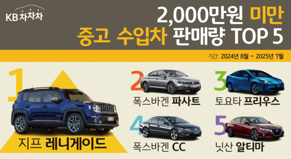 KB캐피탈은 중고차 거래 플랫폼 ‘KB차차차’에서 지난해 8월부터 올해 7월까지 판매된 2000만원 미만 수입 중고차를 분석한 결과, 지프 레니게이드가 거래량 1위를 차지했다고 4일 밝혔다.