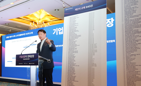 이날 현장에 계단식 규제 343건 내용을 담은 패널을 직접 준비해 온 최 회장은 "한국 경제의 계단식 규제는 과거에는 맞았지만, 지금은 틀린 이야기"라면서 "이 규제가 대한민국의 성장의 정체를 가져오고 민간의 활력을 떨어트리는 근본적인 이유다"라고 강조했습니다.