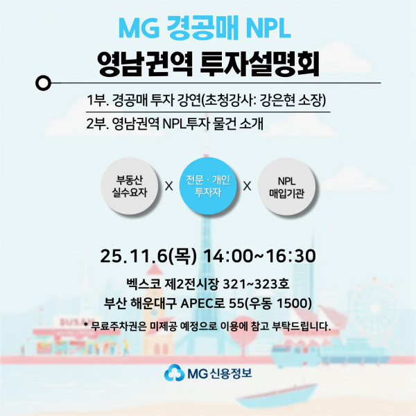MG신용정보는 오는 11월 6일 ‘2025년 경·공매 NPL 영남권역 투자설명회’를 개최한다고 27일 밝혔다.