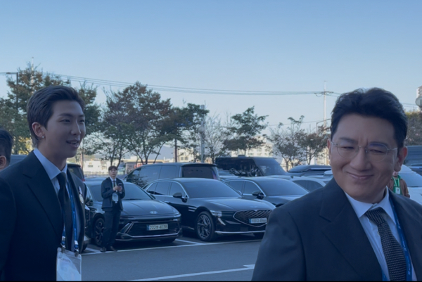방시혁 하이브 의장도 방탄소년단(BTS) RM(김남준)과 함께 행사장에 입장했다. RM은 이날 ‘APEC 내 문화예술 산업과 K-컬처 소프트파워’ 세션에서 발표를 맡았다.
