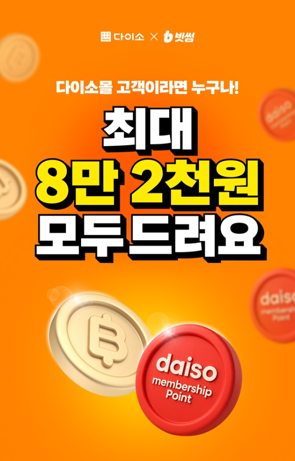 우선 다이소몰 회원 모두에게 2000원 상당의 혜택을 제공한다. 다이소몰 이벤트 페이지에서 '이벤트1 쿠폰'을 발급받고 쿠폰 내 핀번호를 빗썸에 등록하면, 빗썸 원화 1000원과 다이소 멤버십 1000 포인트가 각각 지급된다.
