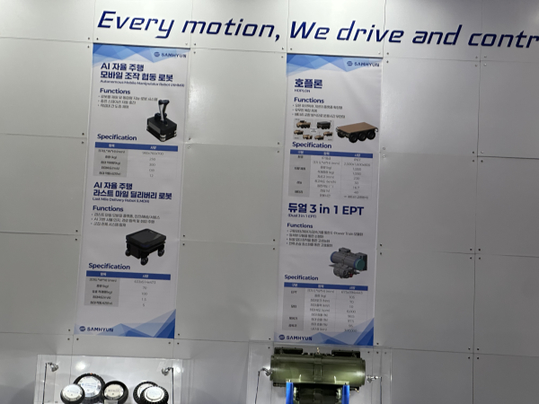삼현은 HAMR 외에도 AMMR(Autonomous Mobile Manipulator Robot, 자율조작이동로봇), 오픈 아키텍처 기반의 무인차량/로봇 공용 플랫폼 '호플론', 방역로봇, 순찰로봇 등 로봇제품 9종도 선보였습니다. 또한, 피지컬 AI 로봇용 관절모터, 이동형 로봇 인휠모터, 자율주행 관제기술 등의 핵심부품과 로봇 솔루션 등도 눈에 띄었습니다.