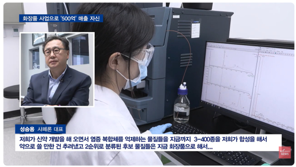 "저희가 신약 개발을 해 오면서 염증 복합체를 억제하는 물질들을 지금까지 3-400종을 저희가 합성을 해서 약으로 쓸 만한 건 추려냈고 2순위로 분류된 후보 물질들은 지금 화장품으로 해서..."