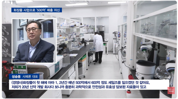 "(경쟁사)화장품이 첫 해에 아마 1, 2년간 매년 500억에서 600억 정도 세일즈를 일으켰던 것 같아요. 저희가 20년 신약 개발 회사다 보니까 충분히 과학적으로 안전성과 유효성 담보된 자료들이 있고 경쟁력이 있다고 생각되고 경쟁사 제품에 버금가는 매출을 조만간 만들 수 있지 않을까 많은 기대를 하고 있습니다."